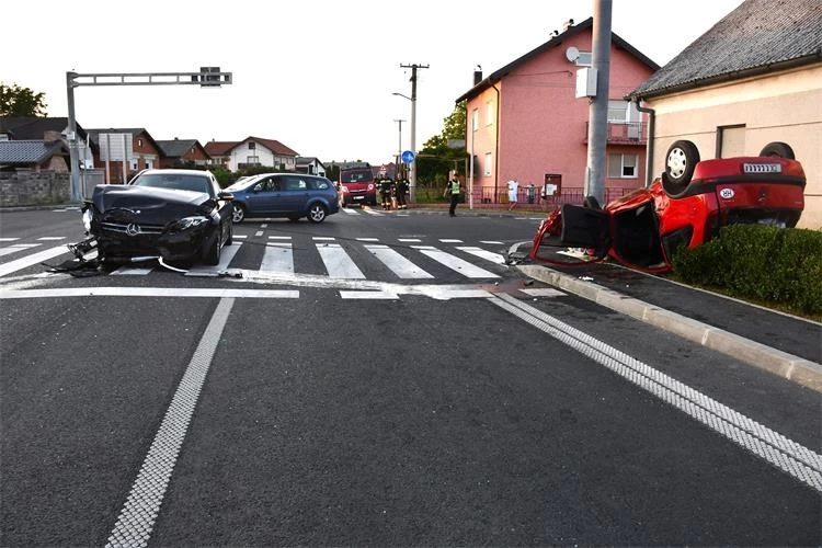 Nakon silovitog sudara, osobni automobil s čakovečkim tablicama odbačen je izvan kolnika, prevrnuo se na krov te udario u prometni znak i dvorišnu ogradu (živicu).