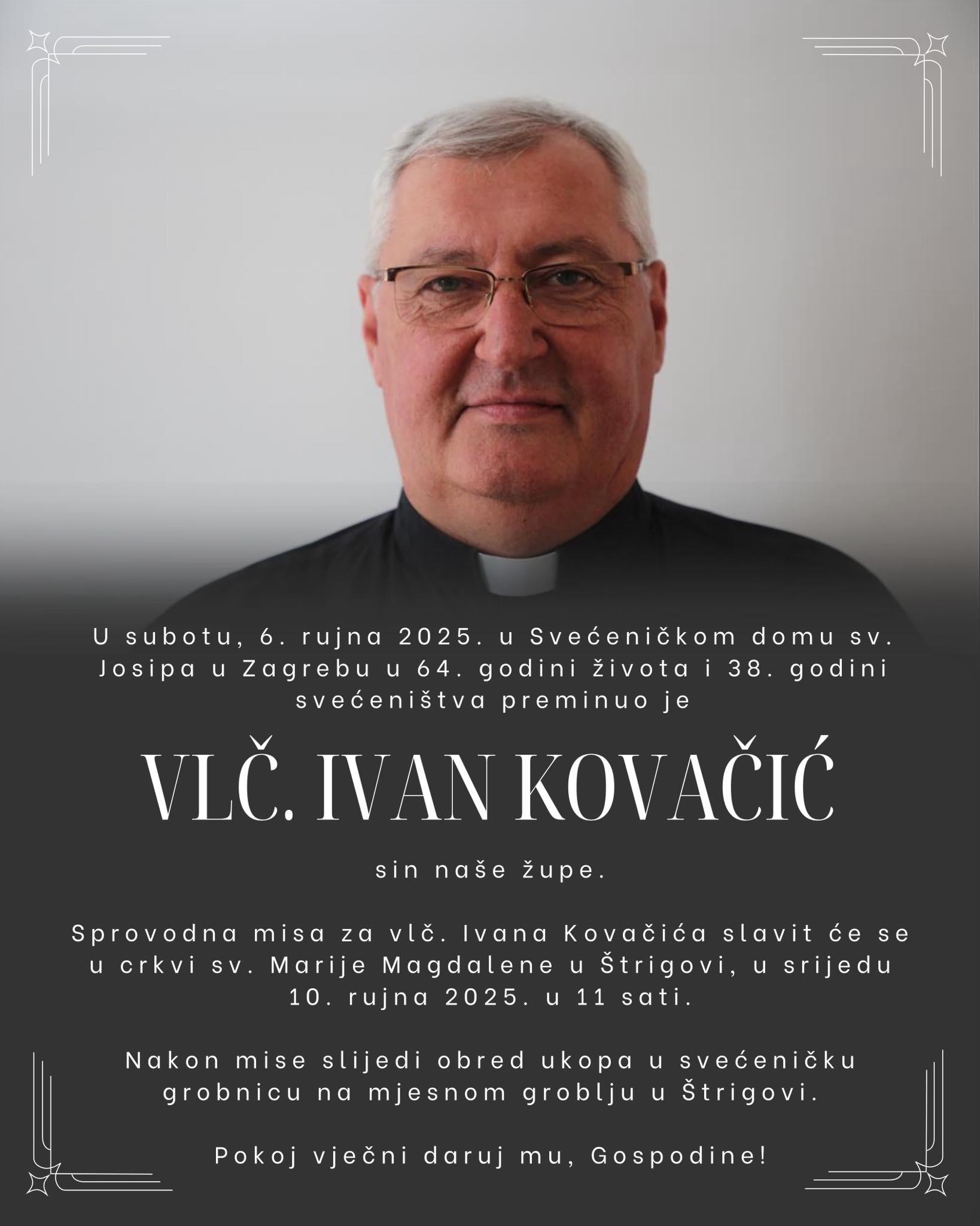 Župa Štrigova tuguje za svojim sinom. Vlč. Ivan Kovačić preminuo je u subotu, 6. rujna 2025., u Svećeničkom domu svetog Josipa u Zagrebu.
