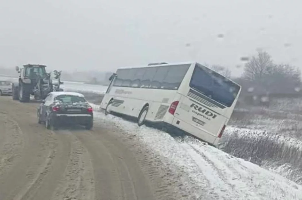 Na fotografiji se vidi autobus koji je završio izvan kolnika, uz cestu prekrivenu snijegom i ledom.
