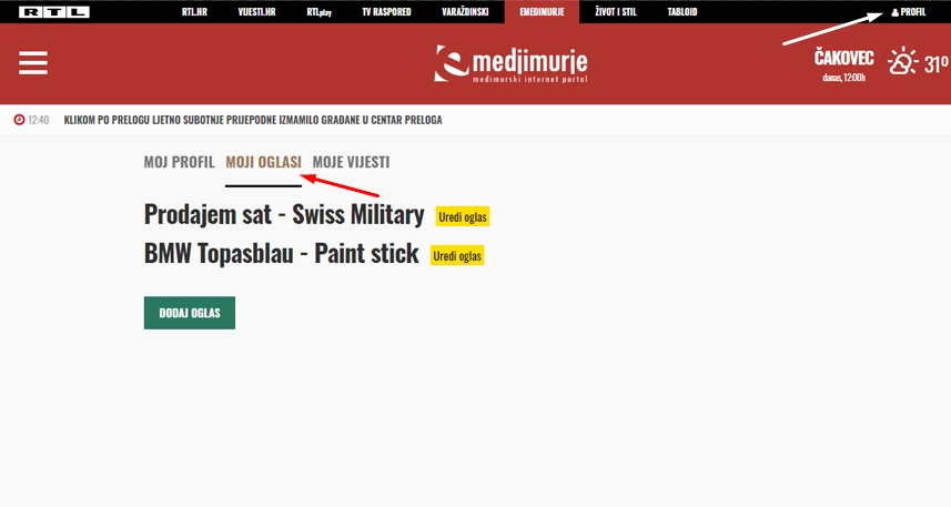 Ako želite uređivati svoje oglase, to činite tako da kliknete u