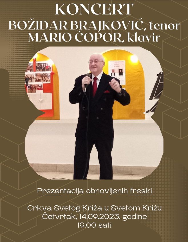 U četvrtak, 14.09.2023. godine, u 19:00 sati, u crkvi Svetog Križa u Svetom Križu, koncert pod nazivom "Na prošćenju u Svetom Križu" održat će tenor Božidar Brajković