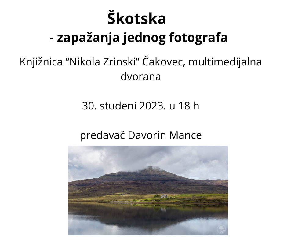 U četvrtak, 30. studenog u 18 sati Knjižnica i čitaonica Grada Čakovca organizira putopisno predavanje 'Škotska - zapažanja jednog fotografa' Davorina Mancea