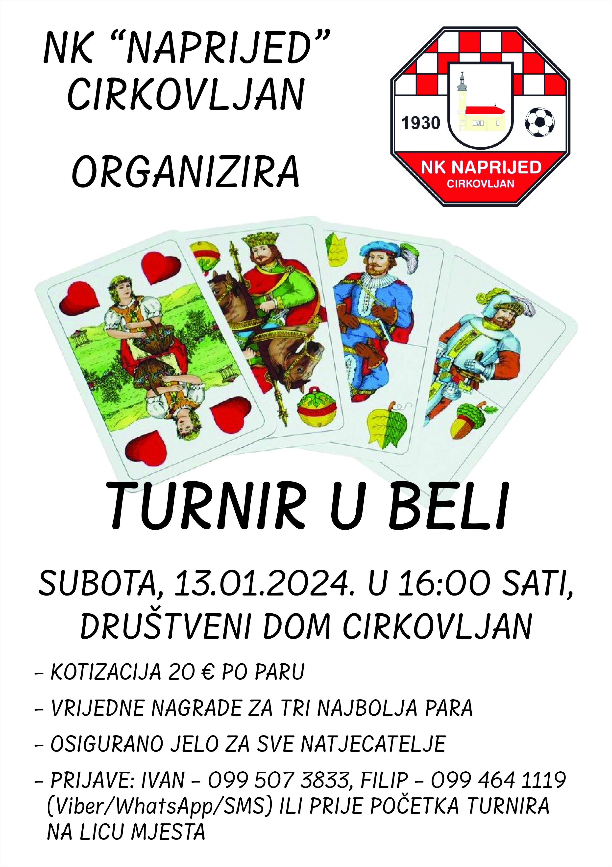 U subotu, 13. siječnja NK Naprijed iz Cirkovljana organizira turnir u popularnoj kartaškoj igri, beli