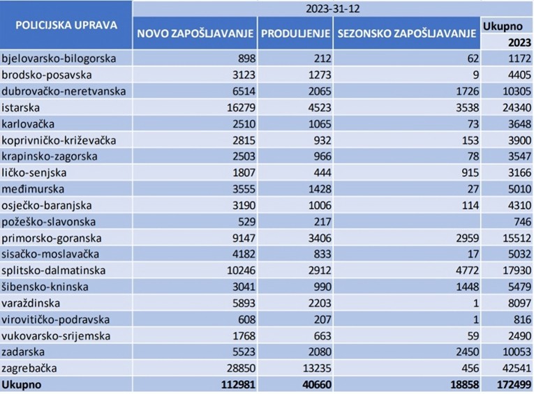 U prošloj je godini Ministarstvo unutarnjih poslova izdalo 172.499 dozvola za boravak i rad, od čega je za novo zapošljavanje izdalo 112.981 dozvolu, što znači da je Hrvatska u 2023. godini primila toliko novih stranih radnika u trajnom zaposlenju
