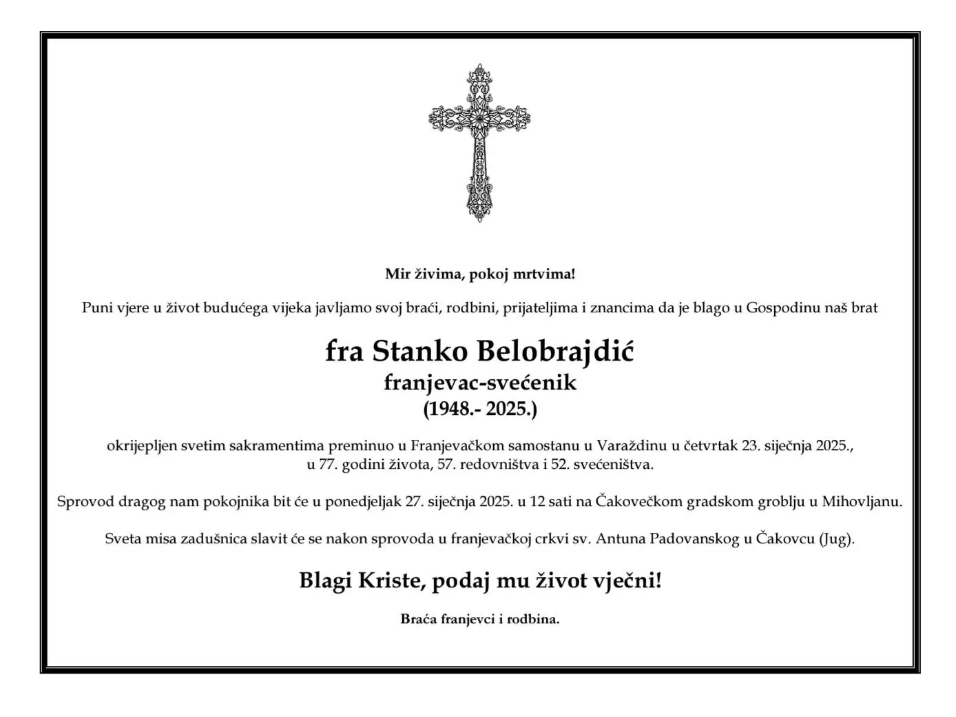 Danas, 23. siječnja 2025. godine, u Franjevačkom samostanu u Varaždinu preminuo je fra Stanko Belobrajdić u 77. godini života, 57. godini redovništva i 52. godini svećeništva.