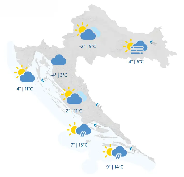 Temperature će ostati u zimskom rasponu – najniže jutarnje vrijednosti zraka kretat će se većinom između -4 i -1 °C u unutrašnjosti, dok će na Jadranu biti osjetno toplije, s temperaturama od 4 do 9 °C.