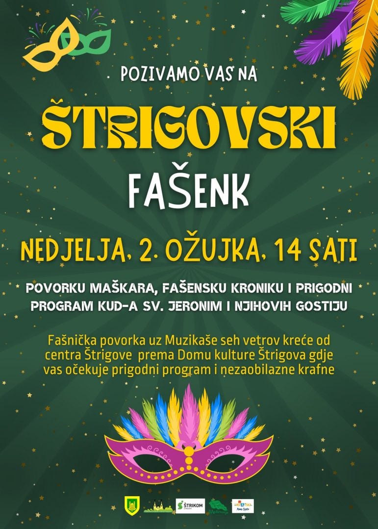 Veselo fašničko obilježavanje započet će u 14 sati šarenom povorkom maski koja će krenuti iz centra Štrigove prema Domu kulture uz pratnju poznatih “Muzikaša seh vetrov”.