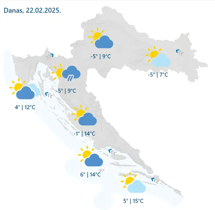 Danas nas očekuje djelomice sunčano vrijeme uz postupni porast naoblake. Na zapadu zemlje već od jutarnjih sati prevladavat će oblačnije vrijeme, dok će se poslijepodne i osobito navečer u Gorskom kotaru i na sjevernom Jadranu pojaviti mogućnost slabe kiše.