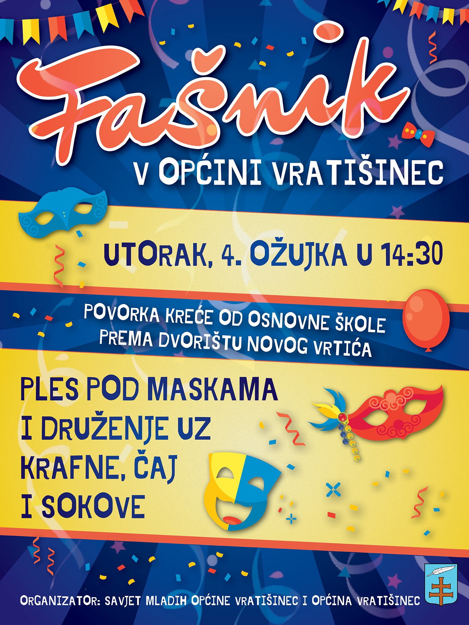 U utorak, 4. ožujka, s početkom u 14:30 sati, održat će se Fašnik v Općini Vratišinec koji će okupiti maštovite maske, veselu povorku i puno dobre zabave.