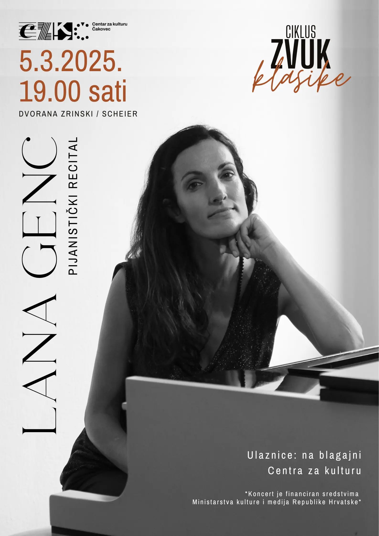 Lana Genc studirala je klavir u Zagrebu i u Beču, a magistrirala je u klasi Lovre Pogorelića. Njen profesionalni glazbeni put već ju je sa 17 godina odveo na turneju po Japanu, a kasnije je gostovala diljem Hrvatske, Europe, ali i u Sjedinjenim Američkim državama. Njezin prvi CD nagrađen je Porinom u kategoriji za najbolju domaću skladbu. Čakovečkoj publici predstavit će se s romantičarskim i kasno romantičarskim programom Chopina, Rahmanjinova, Schumanna i Berse.