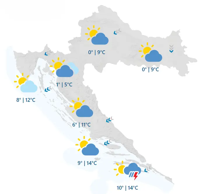 Temperature će se kretati od -2 do 2 °C u unutrašnjosti, dok će na Jadranu najniže vrijednosti biti između 6 i 10 °C.