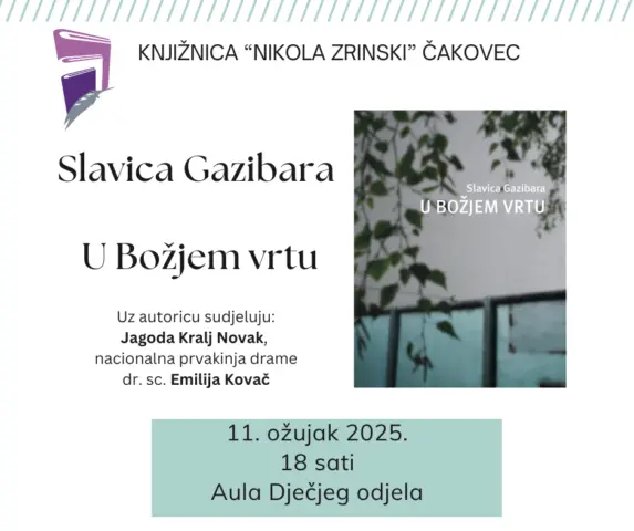 Knjižnica “Nikola Zrinski” Čakovec poziva vas u utorak, 11. ožujka, u 18 sati u Aulu Dječjeg odjela na predstavljanje knjige “U Božjem vrtu” autorice Slavice Gazibara