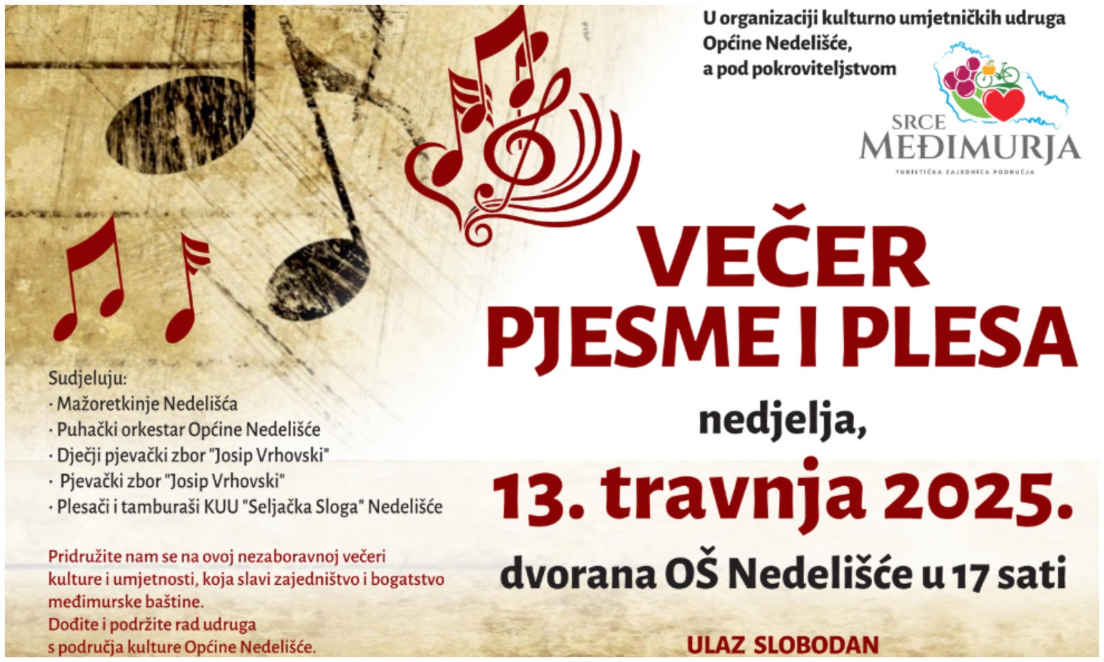 Kulturno umjetničke udruge Općine Nedelišće, uz podršku Turističke zajednice područja Srce Međimurja, ponosno vas pozivaju na tradicionalnu manifestaciju „Večer pjesme i plesa“