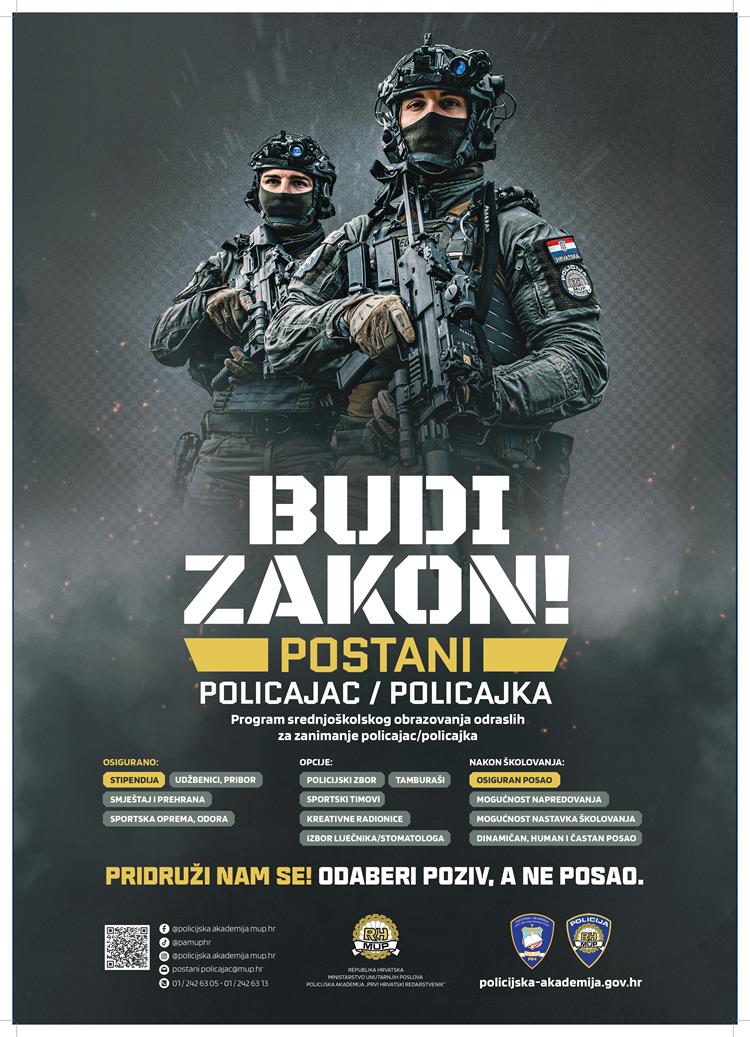 Ministarstvo unutarnjih poslova objavilo je Natječaj za upis polaznika/polaznica u Program srednjoškolskog obrazovanja odraslih za zanimanje policajac/policajka u 2025./2026. godini i Natječaj za upis učenika u III. razred Policijske škole “Josip Jović” za stjecanje strukovne kvalifikacije za zanimanje policajac/policajka u 2025./2026. godini.