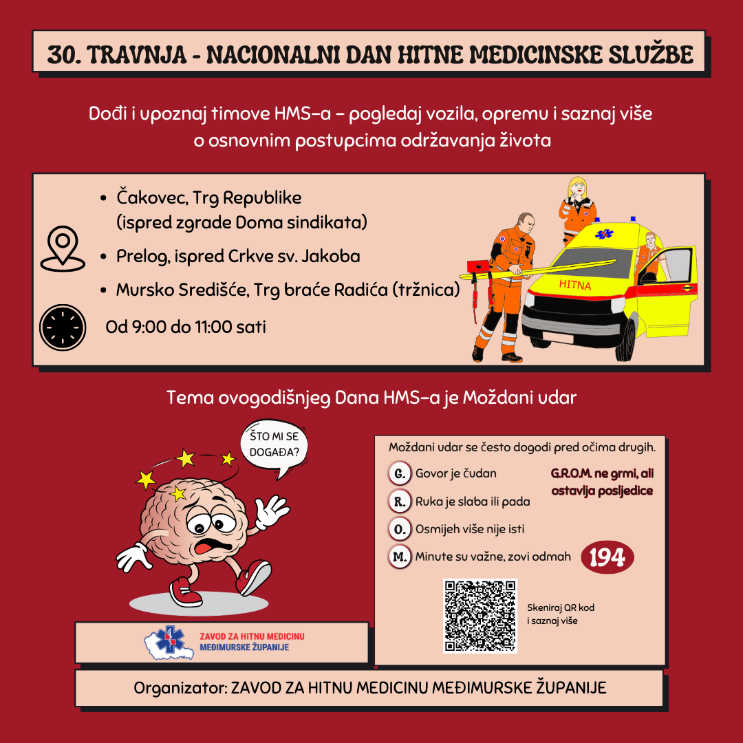 Županijski Zavod za hitnu medicinu Međimurske županije poziva građane da se pridruže obilježavanju Nacionalnog dana hitne medicinske službe, koje će se održati u četvrtak, 30. travnja, od 9:00 do 11:00 sati na tri lokacije diljem Međimurja: u Čakovcu (Trg Republike, ispred zgrade Doma sindikata), Prelogu (ispred Crkve sv. Jakoba) i Murskom Središću (Trg braće Radića – tržnica).