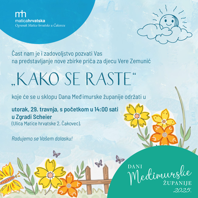 U utorak, 29. travnja, s početkom u 14:00 sati Ogranak Matice hrvatske u Čakovcu u Zgradi Scheier upriličit će svečano predstavljanje nove zbirke priča za djecu „Kako se raste“ čakovečke književnice i dugogodišnje članice Ogranka Vere Zemunić.