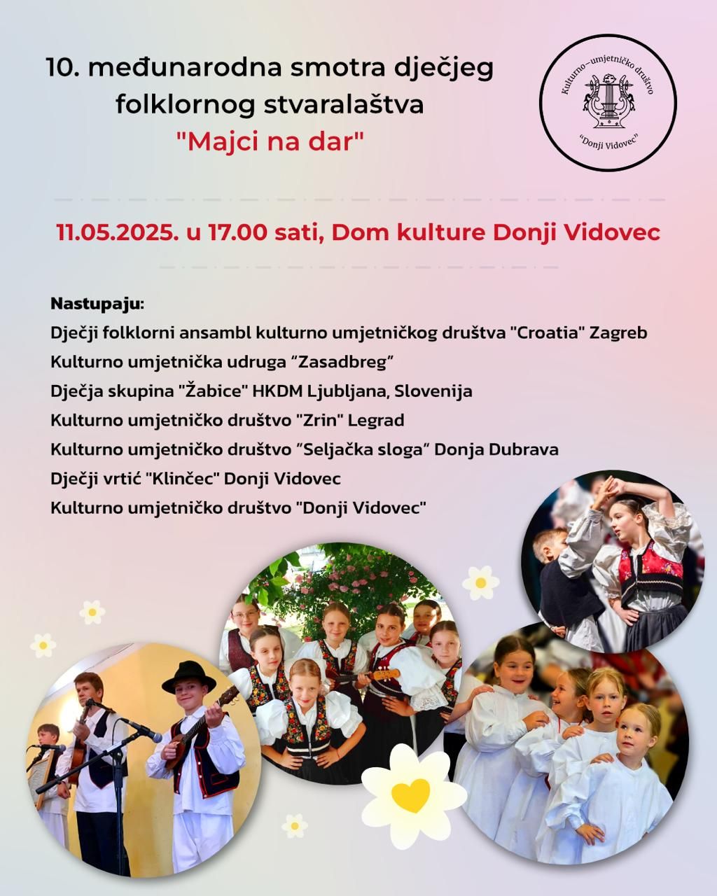 S velikim veseljem Kulturno-umjetničko društvo Donji Vidovec najavljuje 10. međunarodnu smotru dječjeg folklornog stvaralaštva pod nazivom „Majci na dar“, koja će se održati u subotu, 11. svibnja 2025. godine s početkom u 17:00 sati u Domu kulture Donji Vidovec.