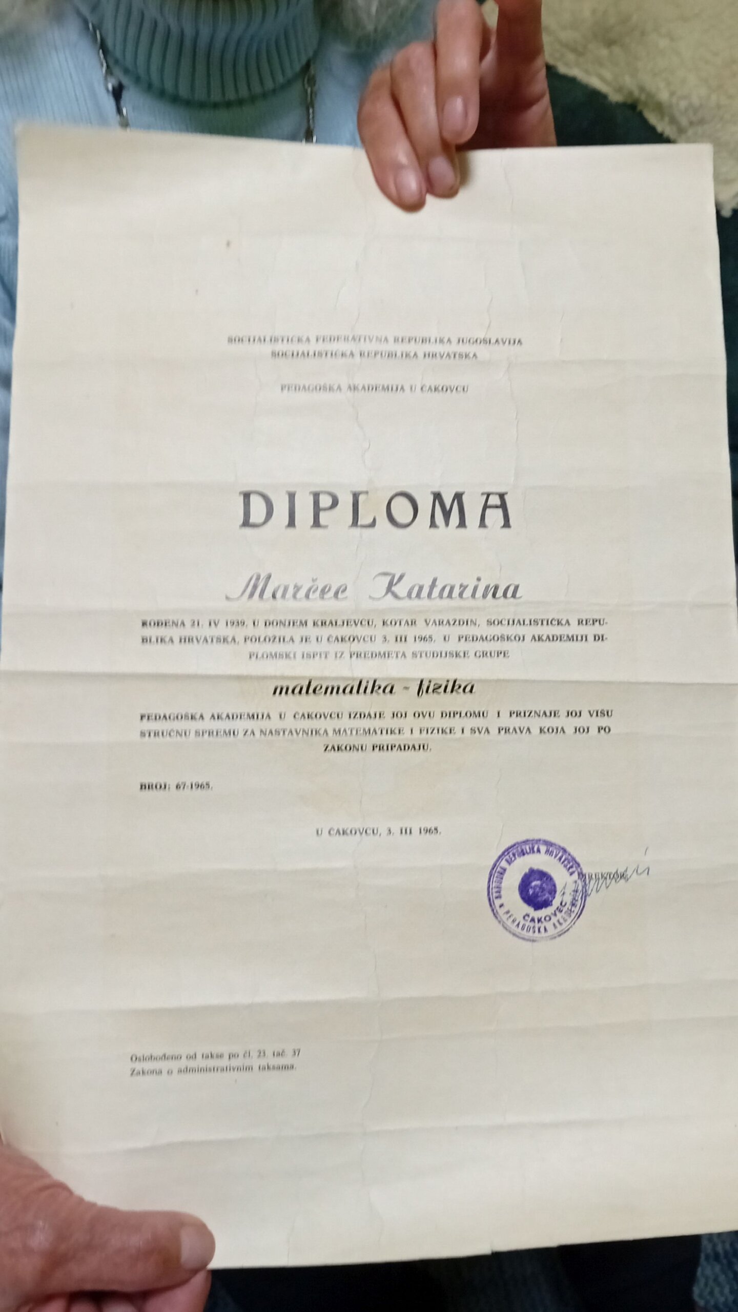 „ Završila sam pravni fakultet, pa pedagoški u Čakovcu, a onda sam kupila fićeka i otišla na PMF. Radila sam po Međimurju , Splitu i okolici, ali i u BIH. Sjećam se svojeg prvog radnog mjesta kada su me u okolici Splita do same škole vodili magarcem. Bilo je tamo tek 5 učenika. Nije bilo kuhinje u školi pa su si djeca donijela jelo od kuće, a meni je jelo donio podvornik i zajedno smo imali užinu. Bilo je to lijepo iskustvo i eto čak su me dvojica mojih tadašnjih učenika došla posjetiti tu u Hodošan. Željna sam bila napredovanja i uvijek spremna kretati iznova. Tako sam upisala i PMF u Zagrebu i sa fićekom odlazila na predavanja. Nakon završetka fakulteta radila sam kao profesorica u gimnaziji predavajući matematiku i fiziku. Evo, ponekad kad me pitaju koji su mi bili najdraži predmeti, ja im odgovorim filozofija i matematika, govori nam Katarina.“