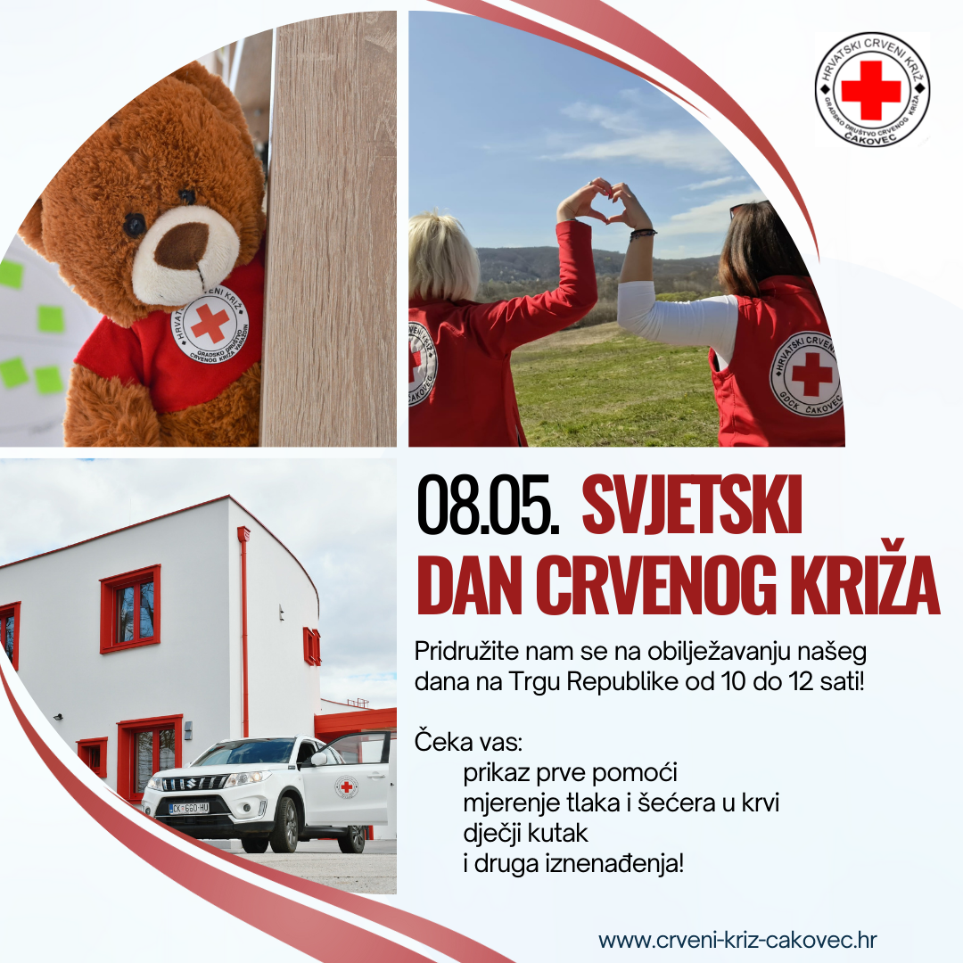 Hrvatski Crveni križ, Gradsko društvo Crvenog križa Čakovec, poziva građane da im se pridruže u obilježavanju Svjetskog dana Crvenog križa u petak, 9. svibnja.