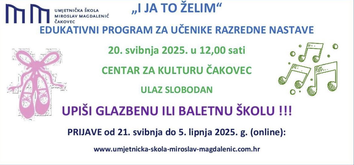 Nakon samog programa, koji se održava u utorak, 20. svibnja 2025. godine, s početkom u 12 sati u Centru za kulturu Čakovec, svi zainteresirani moći će saznati više o upisima u glazbenu i baletnu školu.