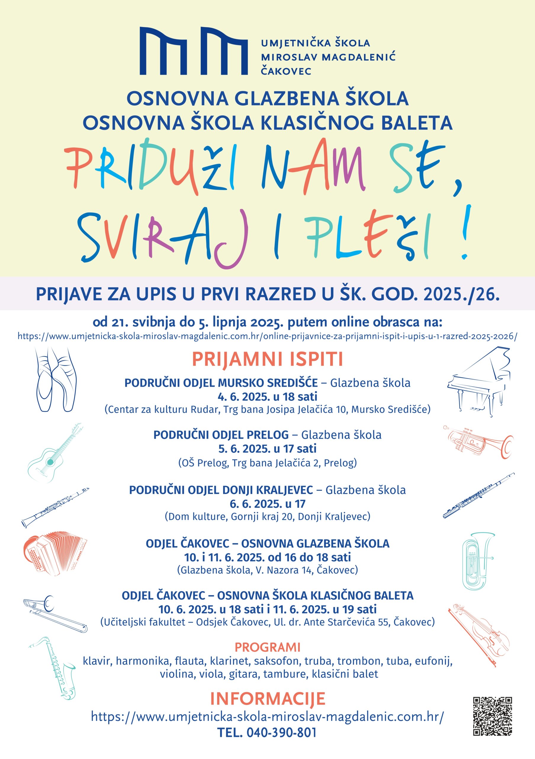 Umjetnička škola Miroslav Magdalenić Čakovec otvara svoja vrata budućim mladim glazbenicima i plesačima! Pozivaju se svi zainteresirani učenici i njihovi roditelji da se prijave za upis u prvi razred osnovne glazbene škole i osnovne škole klasičnog baleta u školskoj godini 2025./26.. Prijave traju od 21. svibnja do 5. lipnja 2025. putem ONLINE OBRASCA