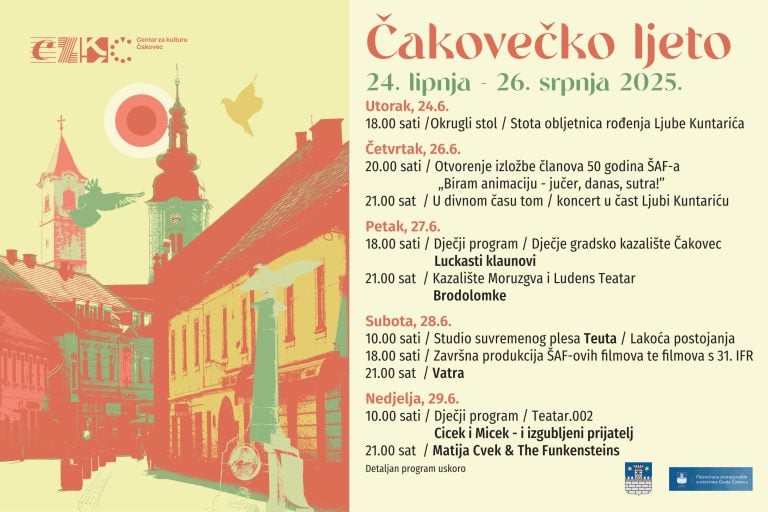 Nakon početnih događanja, program “Čakovečkog ljeta” nastavlja se s kazališnim predstavama za djecu. U petak, 27. lipnja, Gradsko dječje kazalište Čakovec izvest će predstavu “Luckasti klaunovi”, dok će u nedjelju, 29. lipnja, Teatar.002 predstaviti veselu predstavu “Cicek i Micek i izgubljeni prijatelj”.