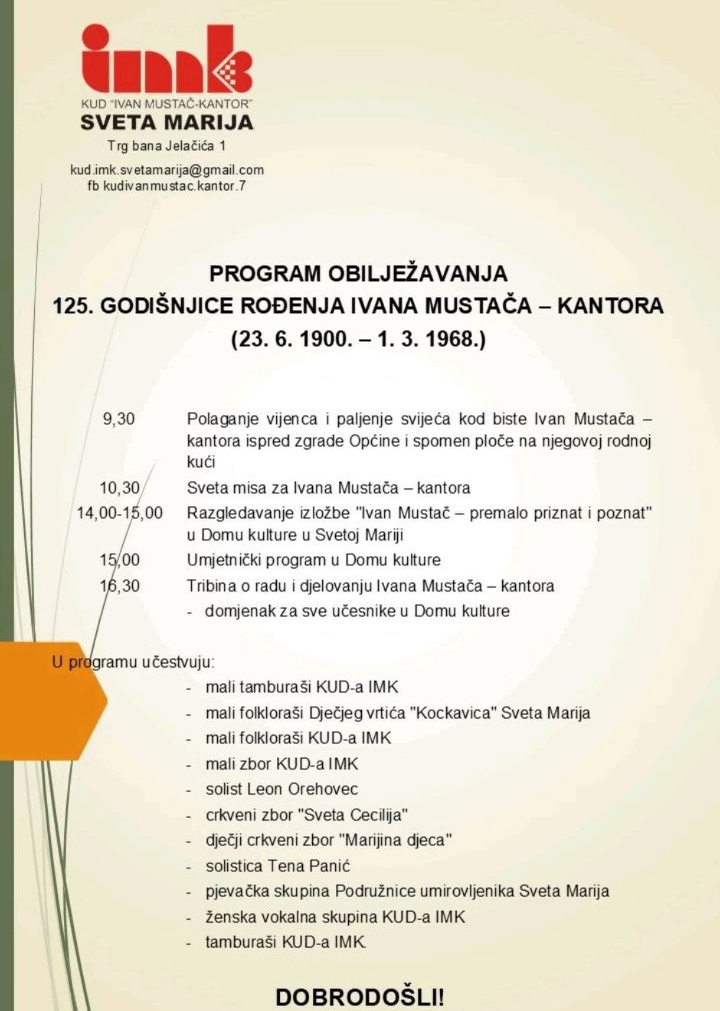 Kulturno-umjetničko društvo "Ivan Mustač Kantor" iz Svete Marije s ponosom najavljuje svečano obilježavanje 125. godišnjice rođenja i 57. godišnjice smrti svojeg osnivača i istaknutog kantora, Ivana Mustača