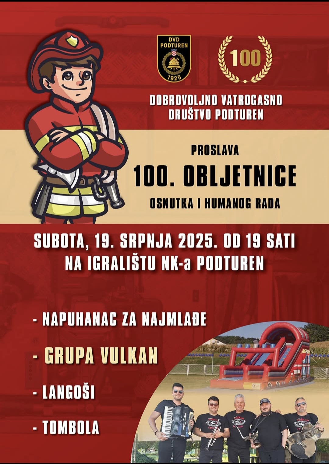 Dobrovoljno vatrogasno društvo Podturen ove godine slavi veliki jubilej – 100. obljetnicu svog osnutka i stoljeće predanog humanog rada! Tim povodom organizira se nezaboravna proslava u subotu, 19. srpnja 2025., s početkom u 19 sati na igralištu NK-a Podturen.