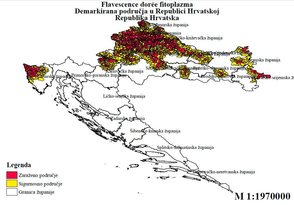 Zlatna žutica vinove loze (Flavescence dorée fitoplazma) čini značajne štete u vinogradima kontinentalnog dijela Republike Hrvatske. Bolest je prisutna i u Istarskoj županiji, dok u ostalim primorskim županijama još uvijek nije utvrđena. Karta demarkiranih područja prikazuje status područja s obzirom na zarazu zlatnom žuticom.