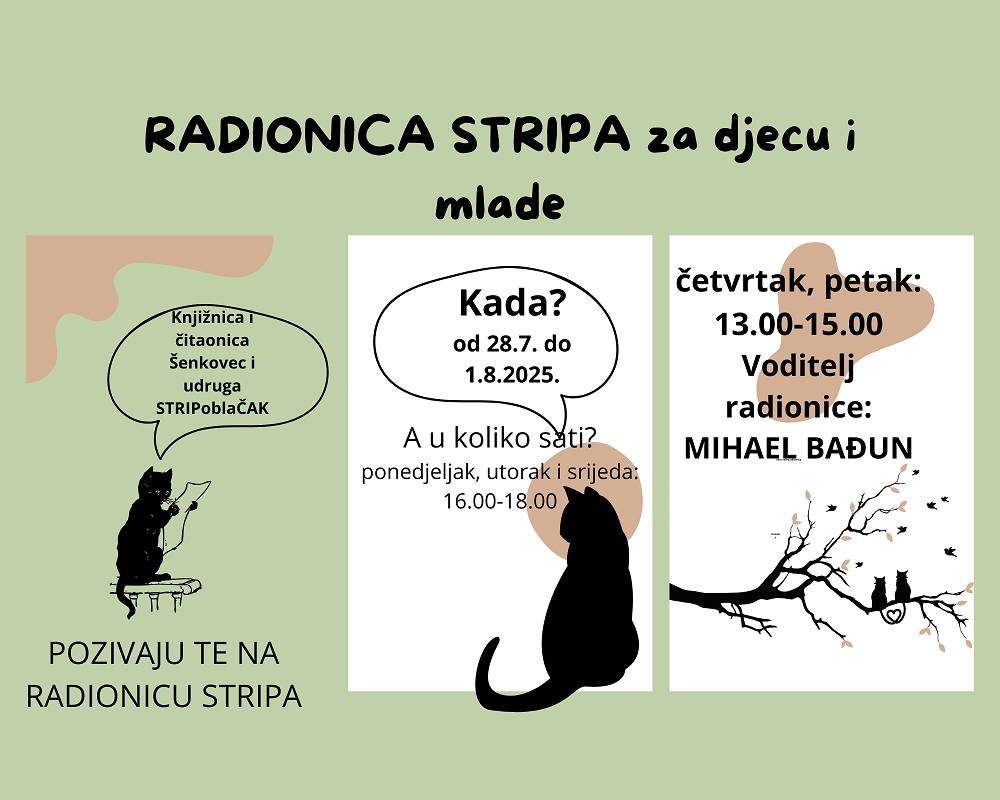 Knjižnica i čitaonica Šenkovec u suradnji s udrugom „STRIPoblaČAK“ ovoga ljeta priprema zanimljive radionice stripa za djecu i mlade, koje će se održavati od 28. srpnja do 1. kolovoza 2025. godine.