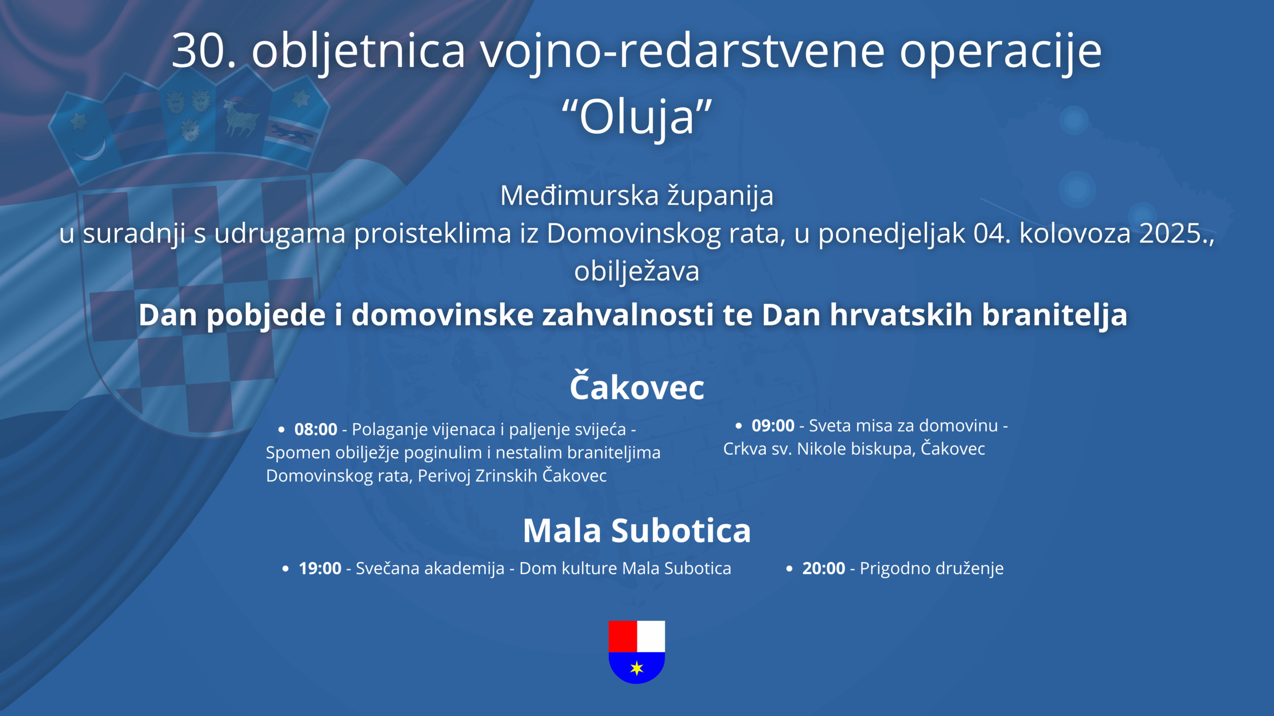 Međimurska županija, u suradnji s udrugama proisteklim iz Domovinskog rata, organizira svečano obilježavanje u Čakovcu i Maloj Subotici.