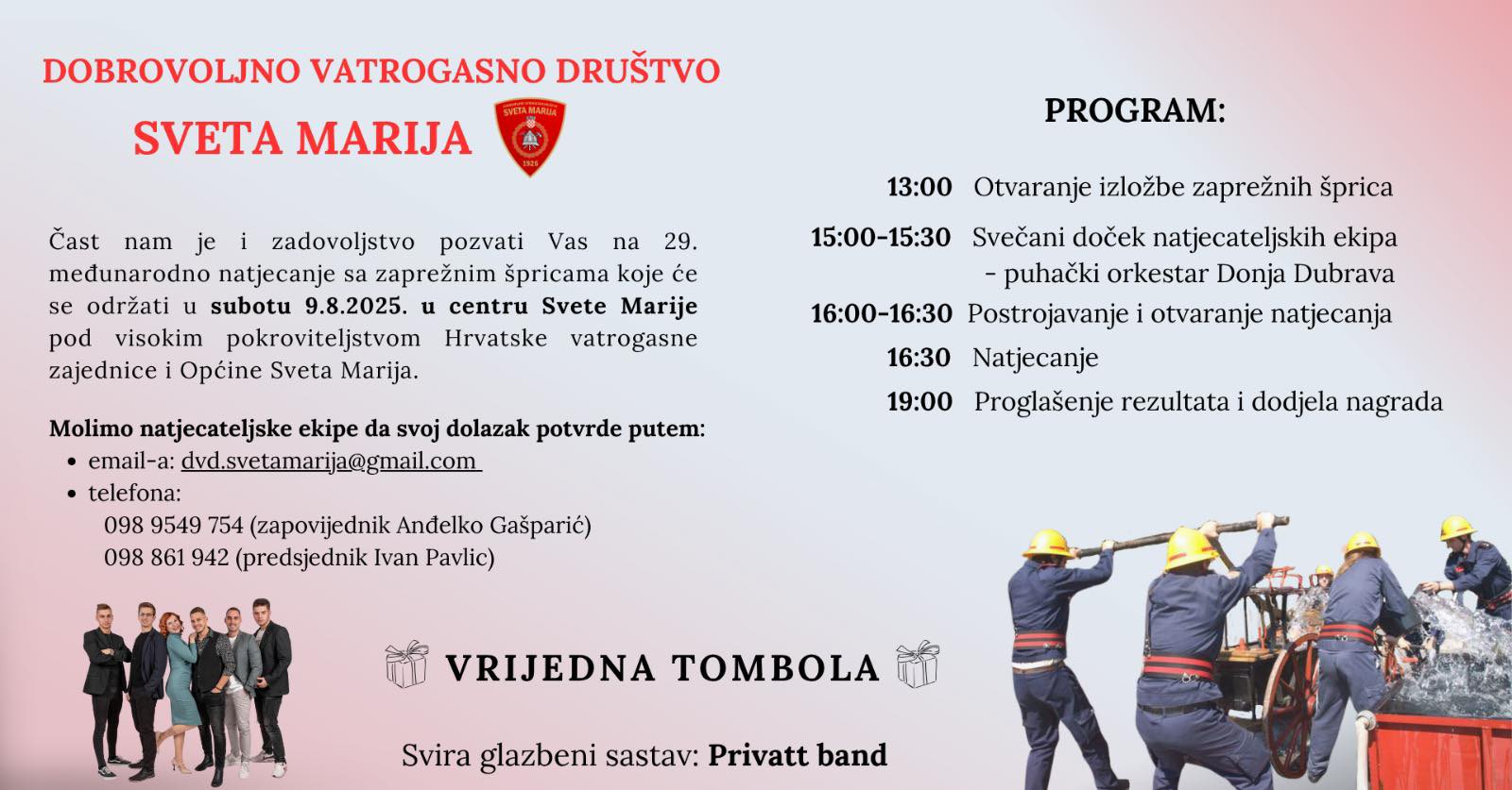Dobrovoljno vatrogasno društvo Sveta Marija i ove godine s ponosom organizira jedno od najatraktivnijih vatrogasnih događanja – 29. međunarodno natjecanje sa zaprežnim špricama, koje će se održati u subotu, 9. kolovoza 2025. godine, u samom centru Svete Marije.
