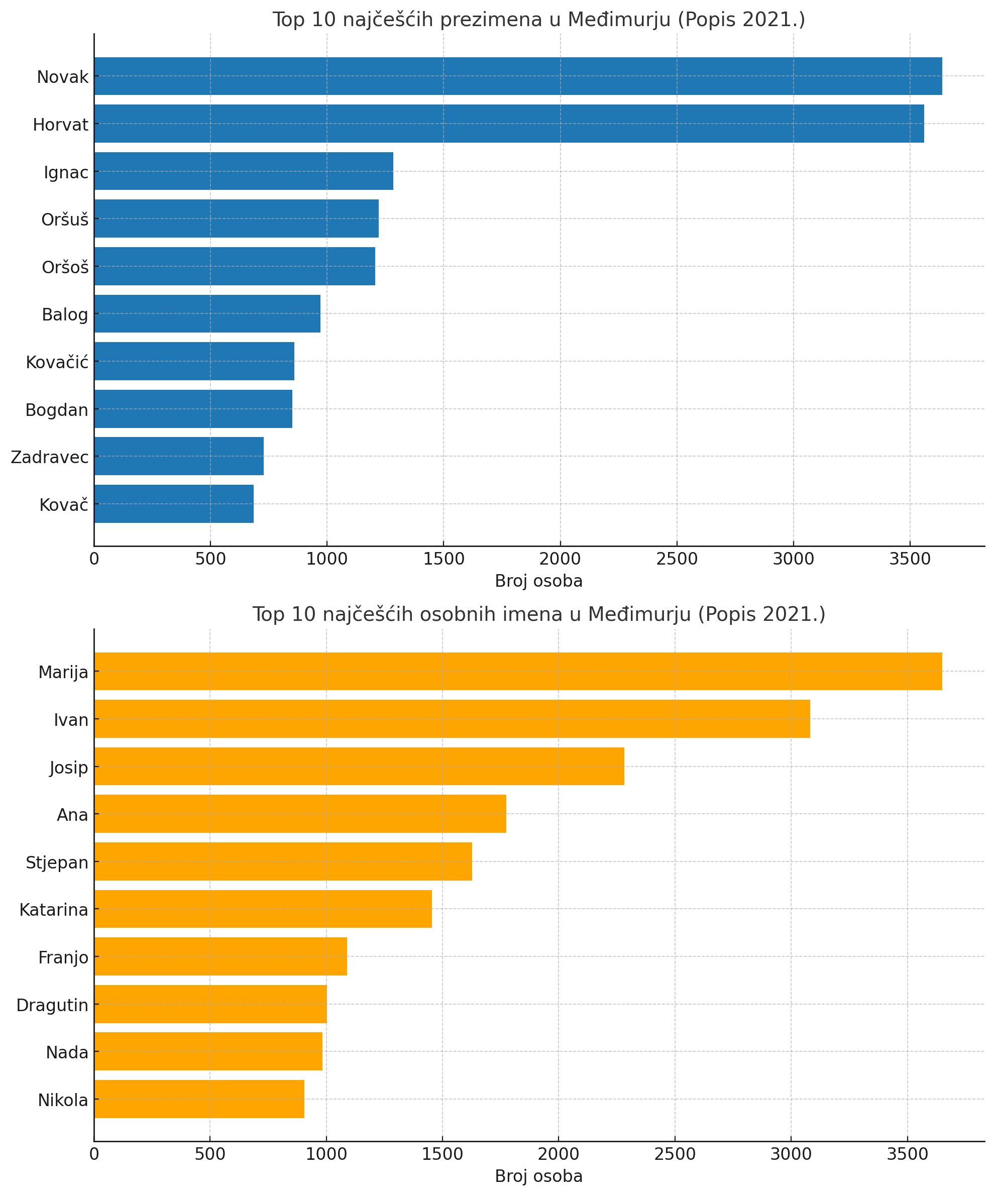 Slična je situacija i s imenima: iako je Ivan najčešće muško ime u Hrvatskoj, u Međimurju je Marija brojčano zastupljenija. Ovakvi podaci pokazuju kako lokalne sredine često imaju snažno očuvane vlastite tradicije, ali su i podložne promjenama kroz generacije.
