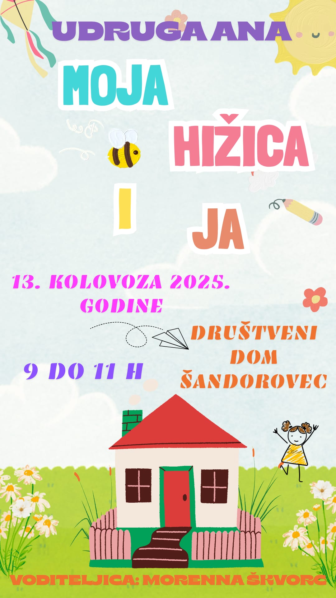Udruga Ana s veseljem obavještava roditelje i djecu iz Šandorovca, Čakovca te svih prigradskih naselja da će se u srijedu, 13. kolovoza 2025. godine, održati kreativna radionica pod nazivom “Moja hižica i ja”. Cilj radionice je kroz igru i kreativno izražavanje potaknuti djecu na promišljanje o važnosti doma i obitelji.