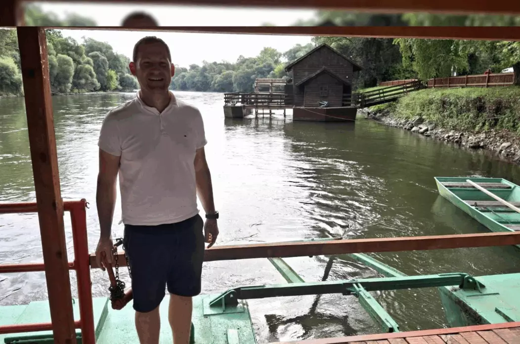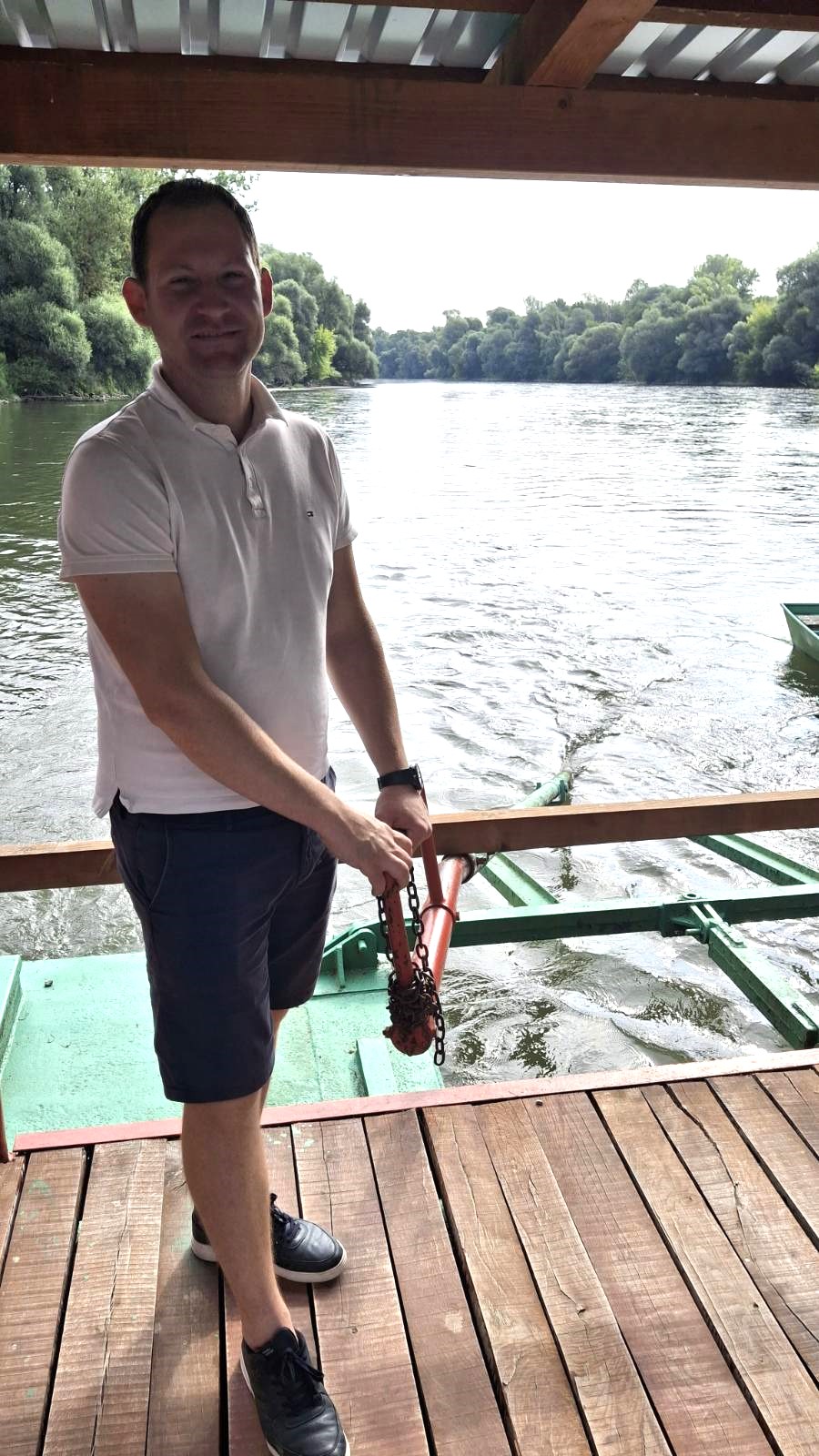Tako nas je danas preveo na skeli preko vode, odnosno rijeke Mure i objasnio kako je za skelarenje položio poseban tečaj kod Lučke kapetanije Osijek i dobio licencu za skelarenje.