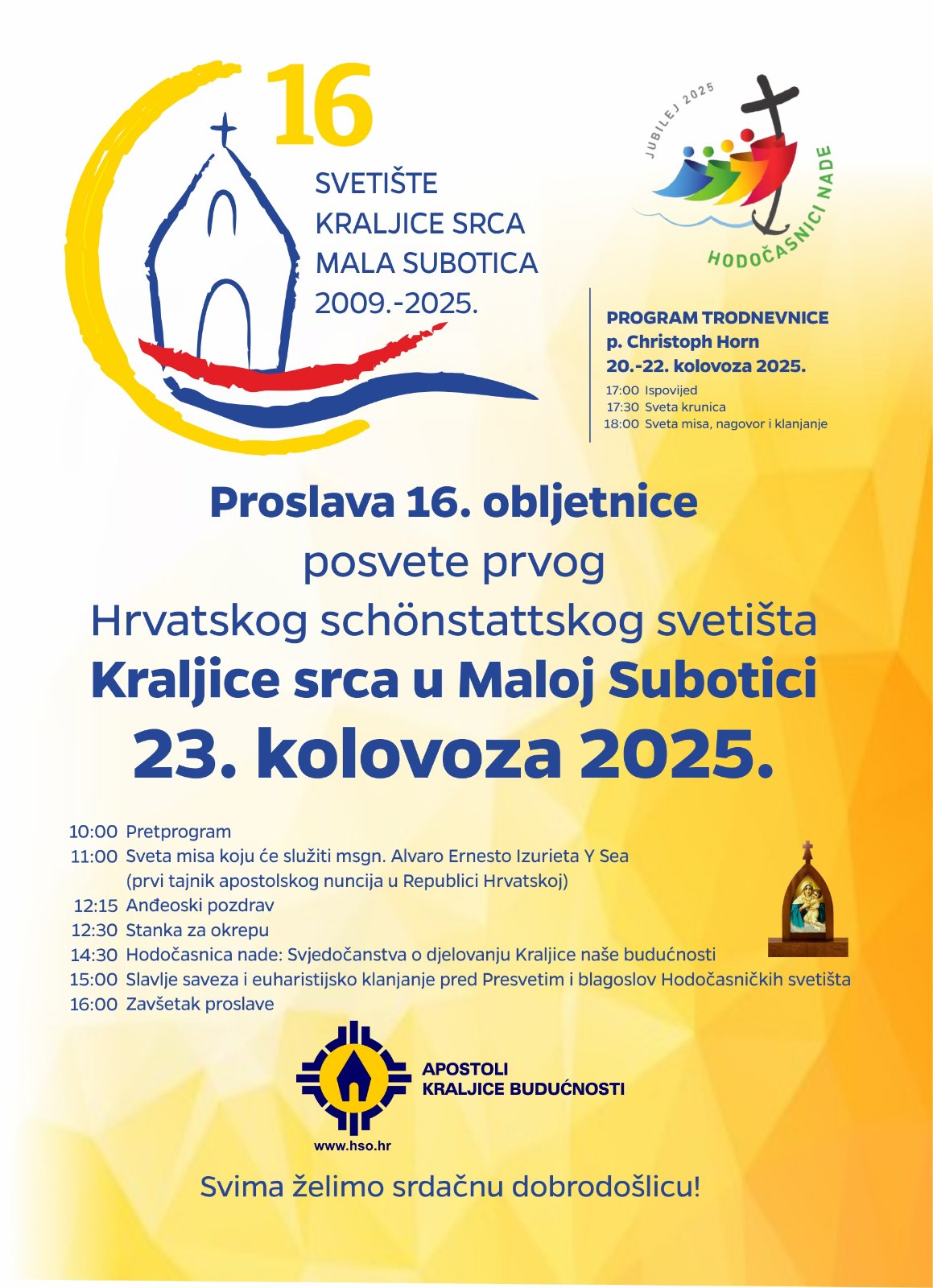 Schönstattsko svetište Kraljice srca u Maloj Subotici prepoznato je kao mjesto mira, molitve i duhovne obnove. Ova obljetnica prilika je za zajedničko slavlje i zahvalnost za sve milosti koje su primljene tijekom proteklih 16 godina.
