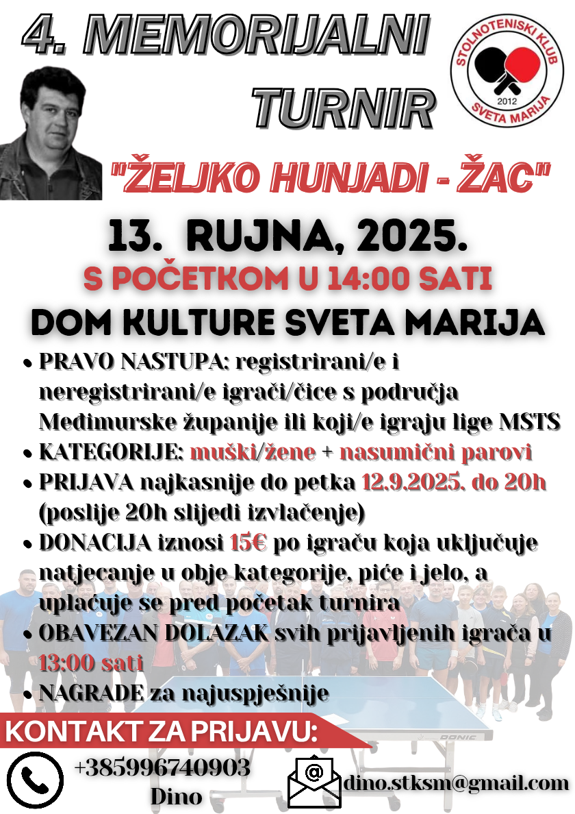 Stolnoteniski klub Sveta Marija s ponosom najavljuje održavanje 4. Memorijalnog stolnoteniskog turnira "Željko Hunjadi - Žac"