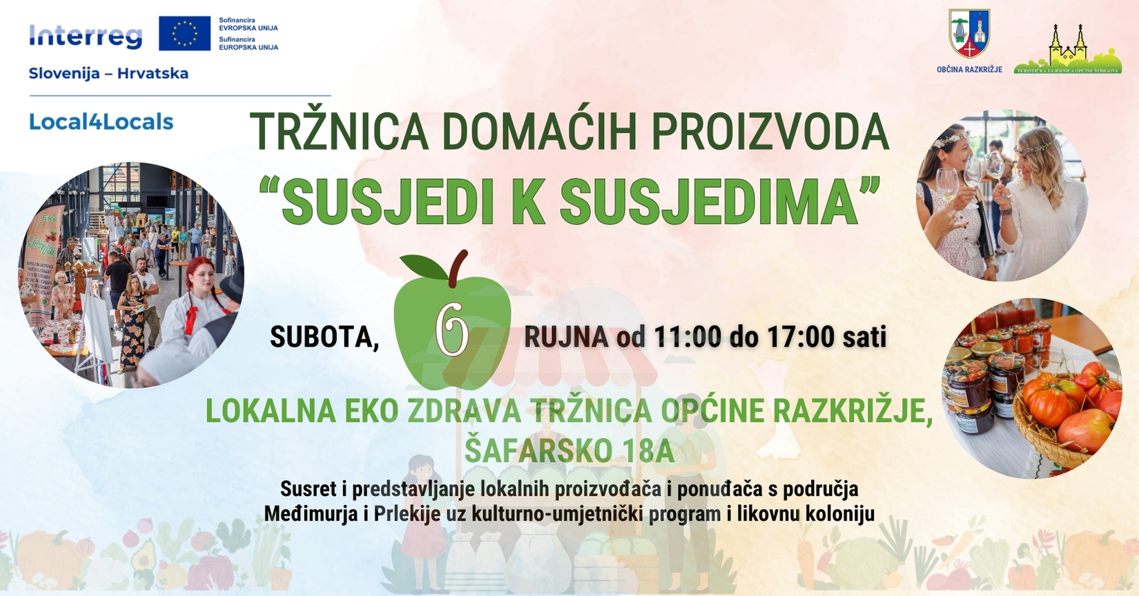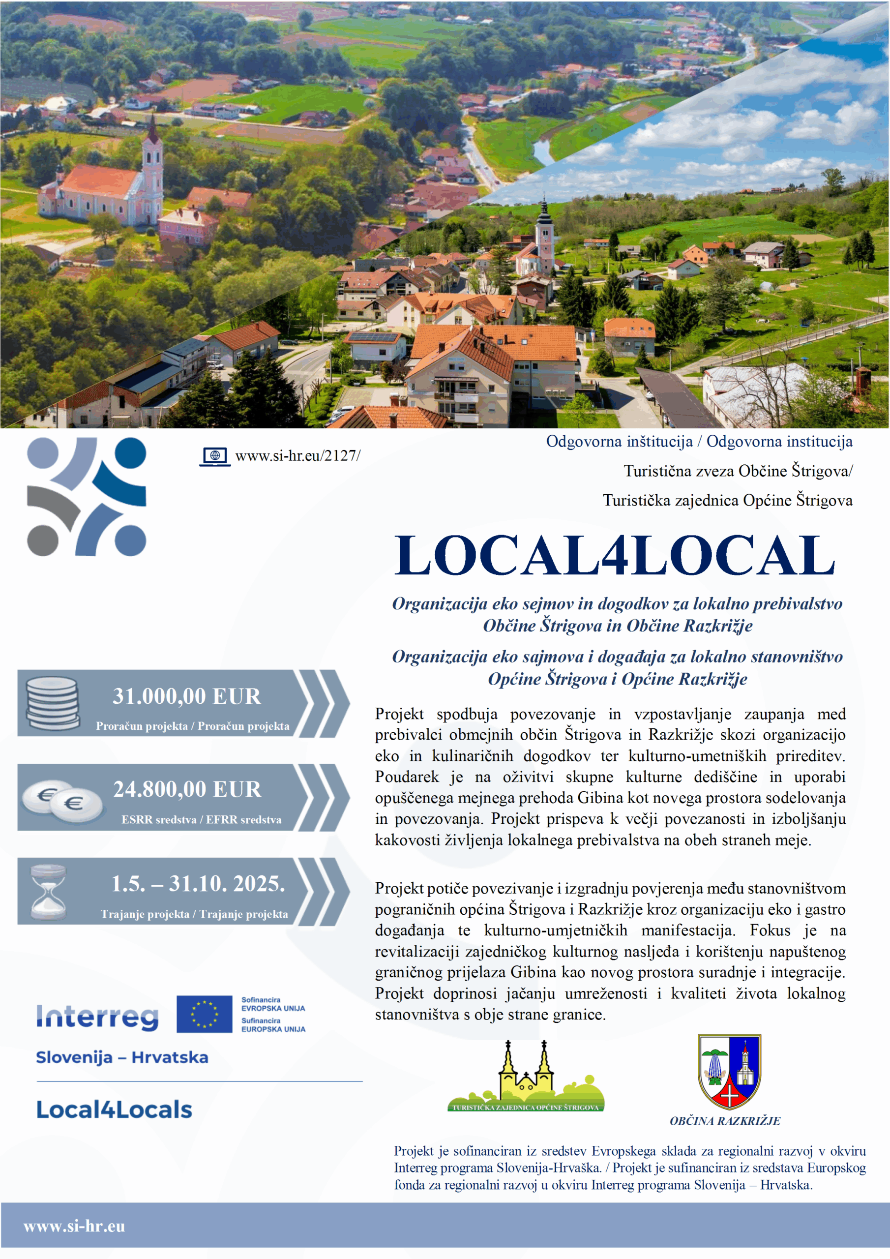 Projekt Local4Locals – organizacija eko sajmova i događaja za lokalno stanovništvo Općine Štrigova i Općine Razkrižje – provodi se u sklopu programa Interreg Slovenija – Hrvatska 2021–2027, uz sufinanciranje Europskog fonda za regionalni razvoj.