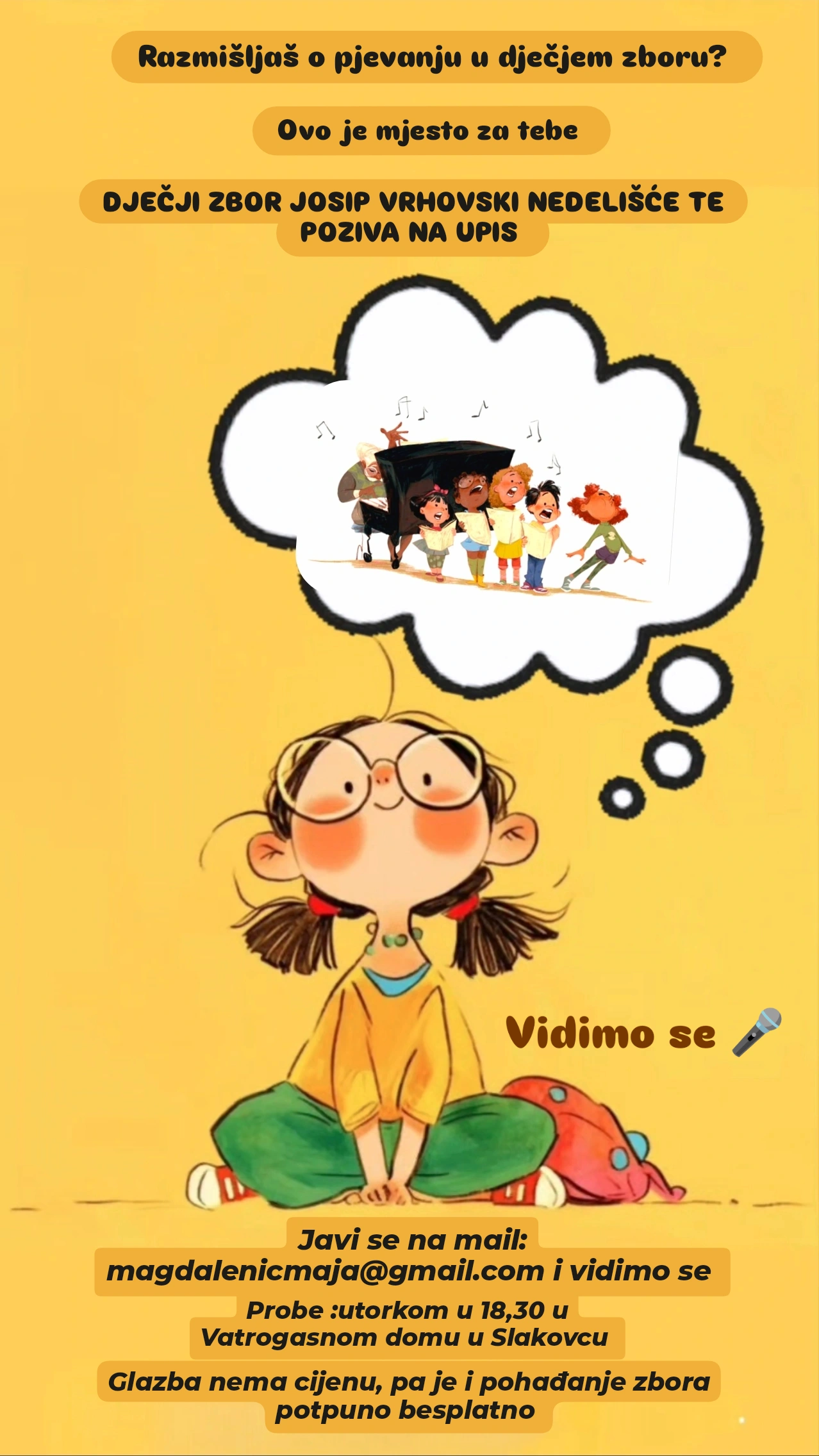 Glazba i dječji smijeh ponovno će ispuniti prostorije Dječjeg zbora Josip Vrhovski Nedelišće, jer su krenuli upisi za novu sezonu 2025./2026.. Zbor poziva sve mališane, već od navršene pete godine života pa nadalje, da postanu dio ove glazbene obitelji i zakorače u svijet pjesme, druženja i kreativnosti.