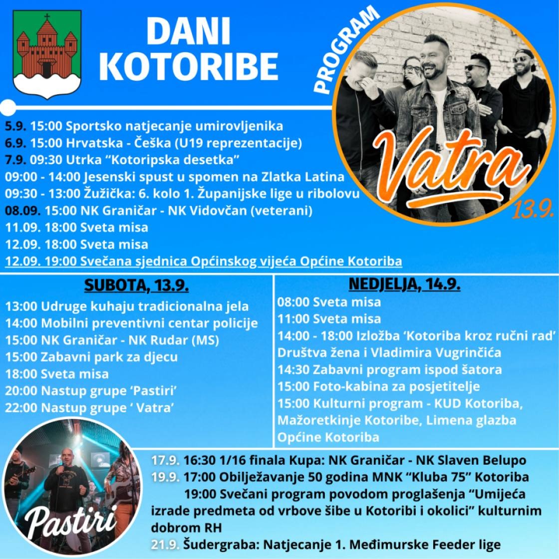 Dani Kotoribe, tradicionalna manifestacija koja svake godine okuplja brojne posjetitelje, održat će se od 5. do 21. rujna na području općine Kotoriba. Program donosi bogat izbor sadržaja za sve generacije – od sportskih natjecanja i kulturnih događanja do koncerata poznatih glazbenih skupina.