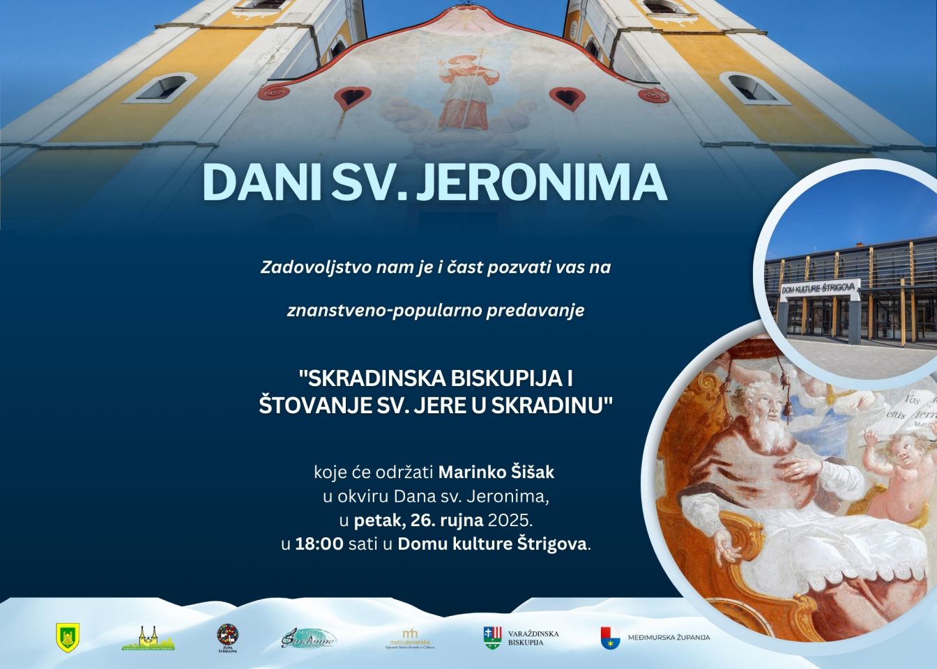 U petak, 26. rujna, u sklopu ovogodišnjih Dana svetog Jeronima u Štrigovi, Ogranak Matice hrvatske u Čakovcu u suradnji s ostalim suorganizatorima ove već tradicionalne manifestacije, ugostit će predsjednika Ogranka Matice hrvatske u Skradinu, gosp. Marinka Šišaka, te gradonačelnika Grada Skradina, gosp. Antonija Brajkovića, koji će u štrigovskom Domu kulture s početkom u 18:00 sati održati predavanje „Skradinska biskupija i štovanje sv. Jere u Skradinu“.