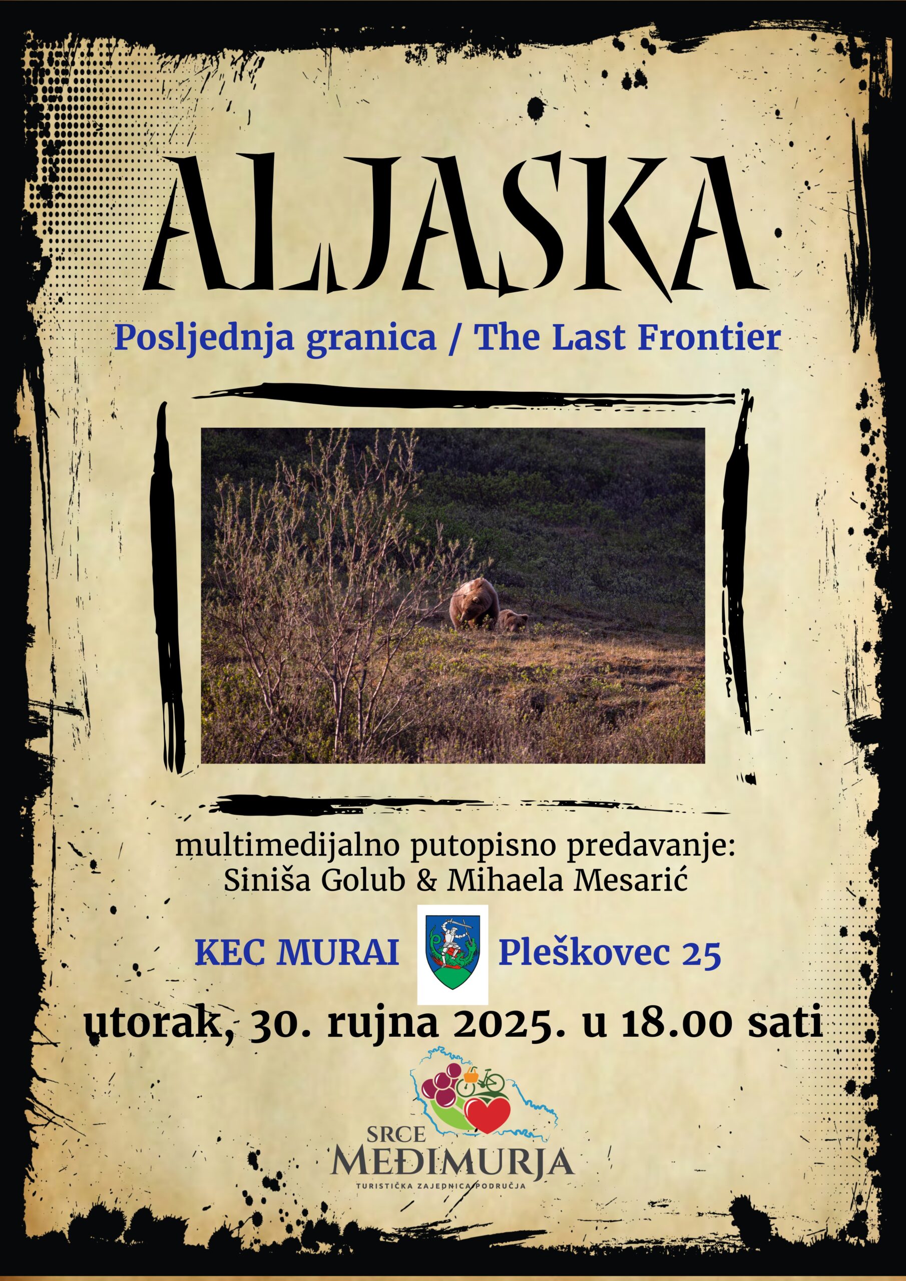 TZP Srce Međimurja poziva vas na premijerno multimedijalno putopisno predavanje “Aljaska – Posljednja granica / The Last Frontier” koje će se održati u utorak, 30. rujna 2025. godine u 18:00 sati u KEC-u Murai (Pleškovec 25).