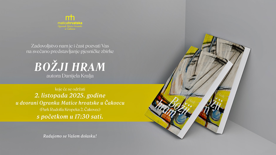 U organizaciji Ogranka Matice hrvatske u Čakovcu, u četvrtak 2. listopada održat će se predstavljanje nove pjesničke zbirke Danijela Kralja pod nazivom „Božji hram“. Događaj će se odviti u dvorani uz prostorije Ogranka na adresi Park Rudolfa Kropeka 2, Čakovec, s početkom u 17:30 sati.