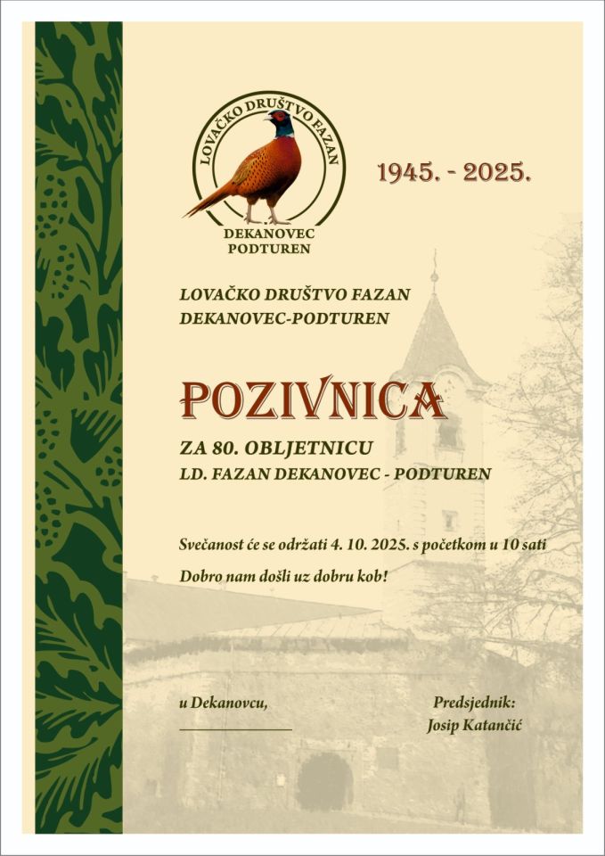 Ove subote u lovačkom domu u Dekanovcu održat će se svečana proslava 80. obljetnice Lovačkog društva „Fazan“ Dekanovec-Podturen