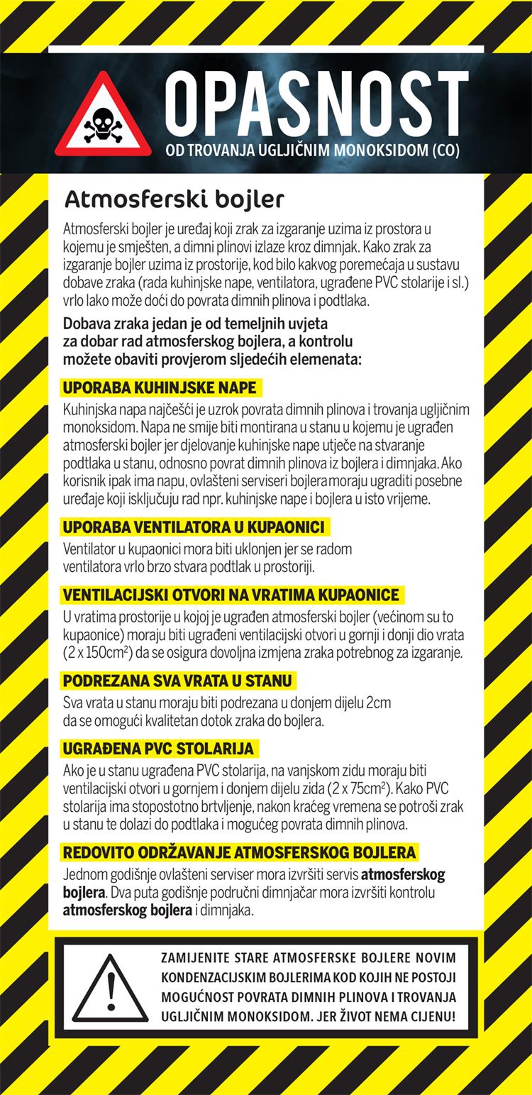 - nabavite detektor ugljičnog monoksida te angažirajte stručnu osobu koja će ga postaviti na za to primjereno mjesto.