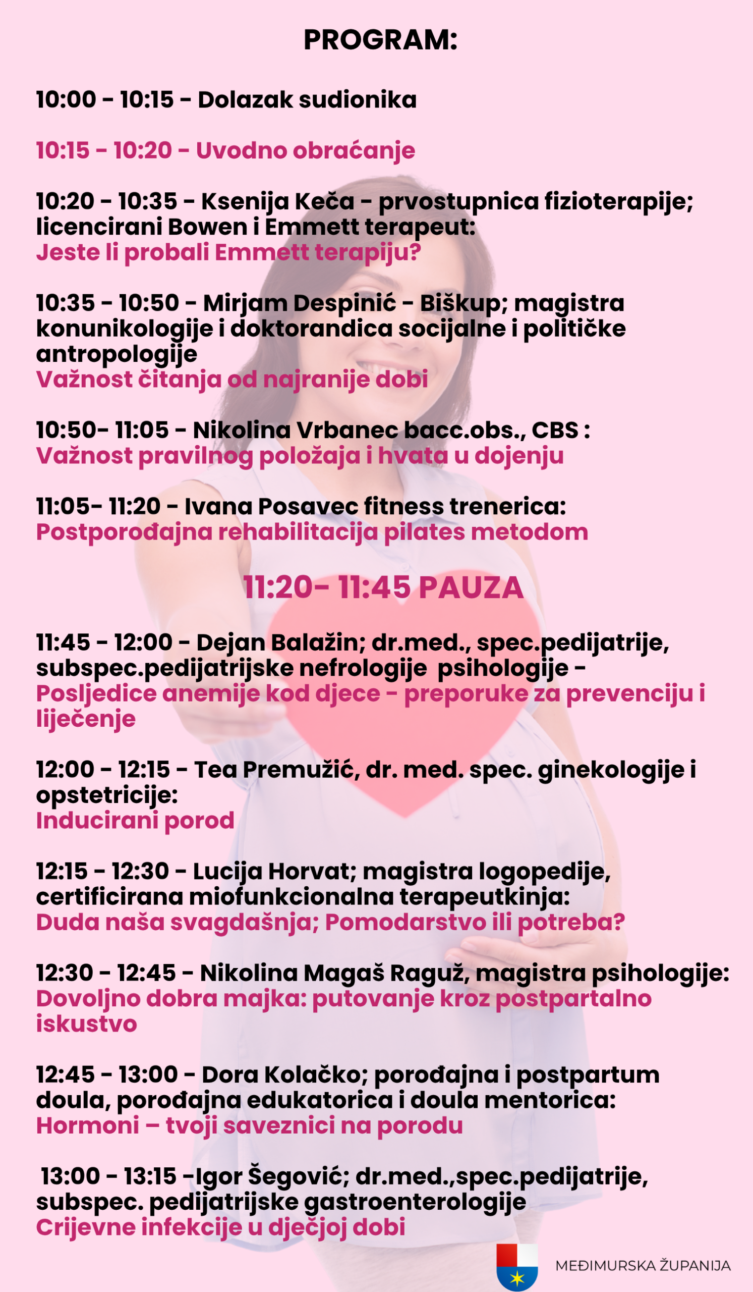 Tijekom trosatnog programa sudionici će imati priliku poslušati predavanja i sudjelovati u tematskim radionicama koje pokrivaju važne teme poput pravilnog položaja i hvata u dojenju, važnosti čitanja od najranije dobi, postporođajne rehabilitacije, induciranog poroda, hormonalnih promjena te prevencije i liječenja dječjih zdravstvenih stanja.