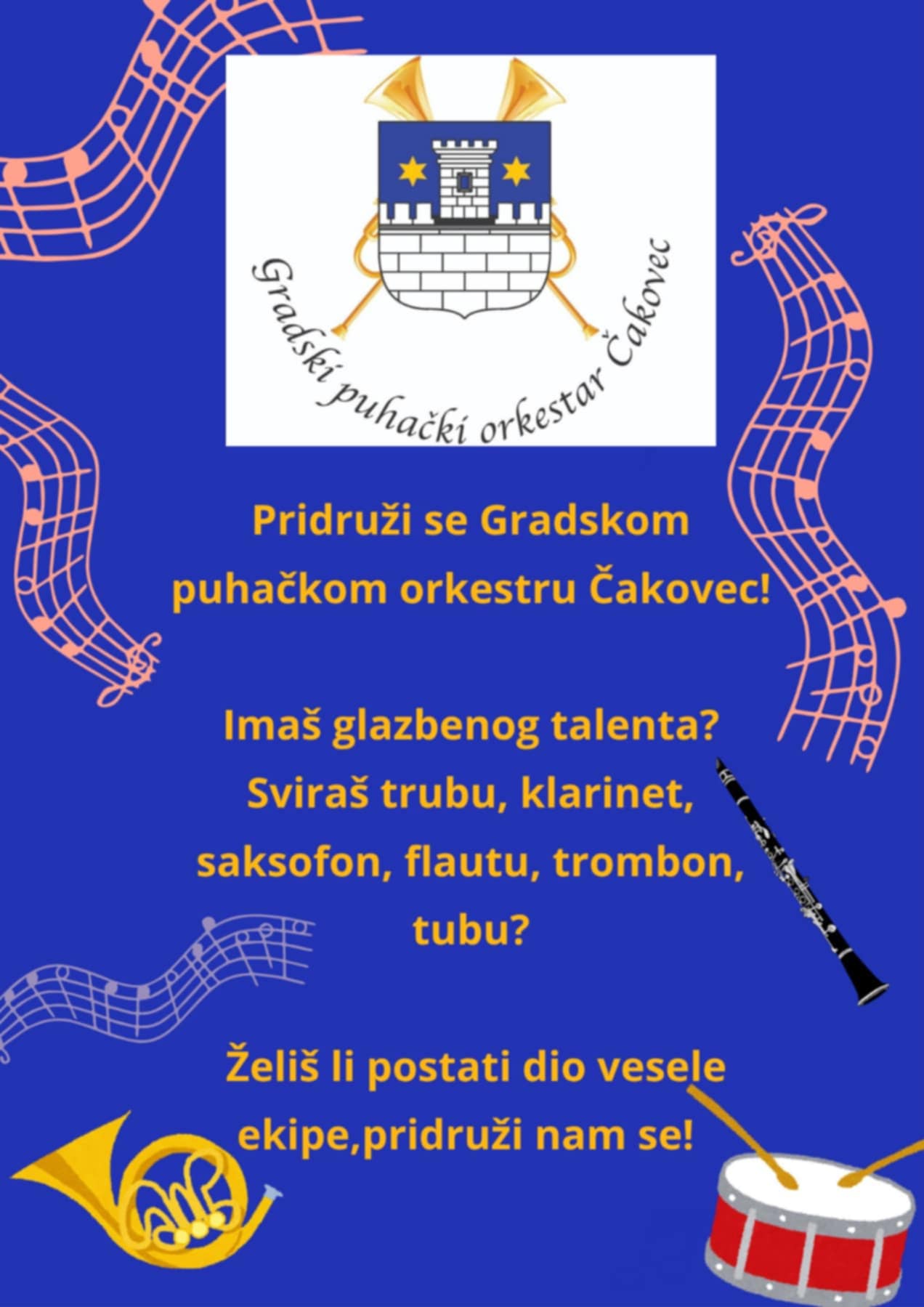Gradski puhački orkestar Čakovec uputio je javni poziv svim glazbenim talentima i zaljubljenicima u puhačke instrumente da se pridruže njihovoj ekipi.