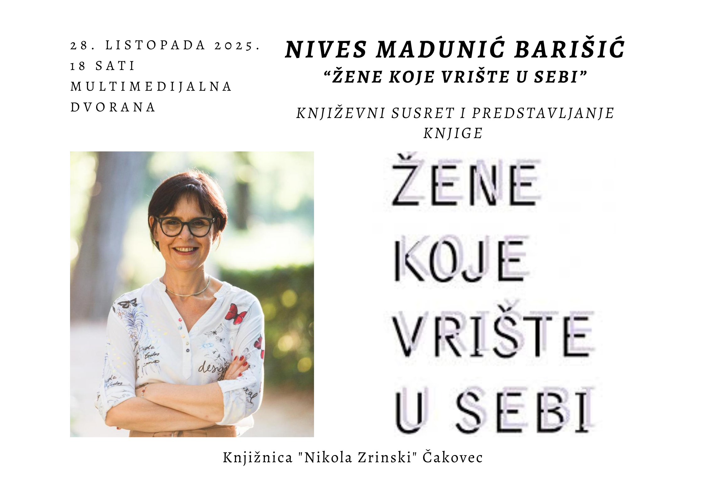 Ljubitelje književnosti očekuje poseban događaj u Knjižnici „Nikola Zrinski“ Čakovec — u utorak, 28. listopada 2025. godine, s početkom u 18 sati, održat će se književni susret s Nives Madunić Barišić i predstavljanje romana „Žene koje vrište u sebi“.