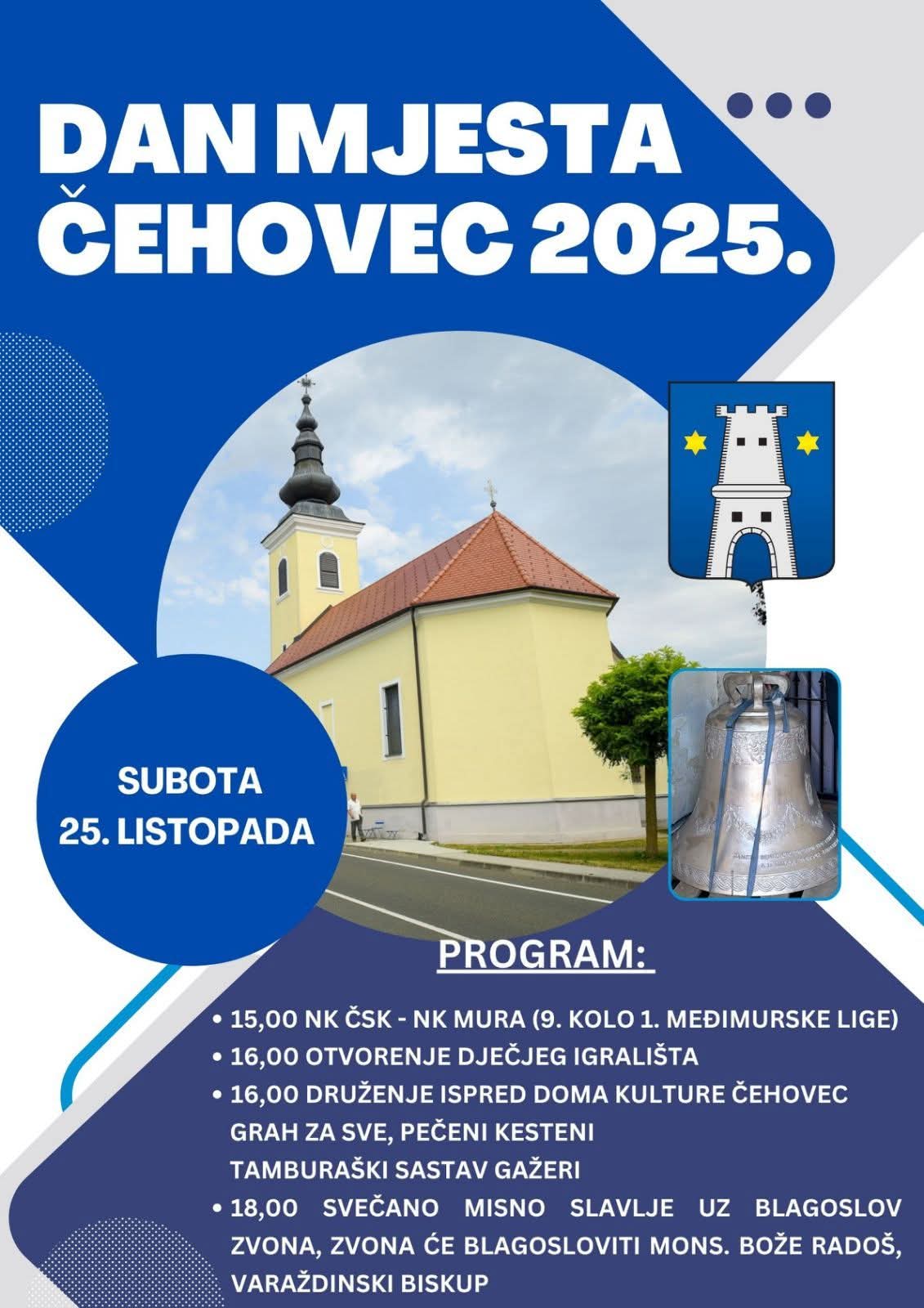 U subotu, 25. listopada, Čehovec slavi svoj dan uz bogat program — sportska utakmica, otvorenje dječjeg igrališta, druženje uz tamburaše i svečano misno slavlje s blagoslovom novih zvona.