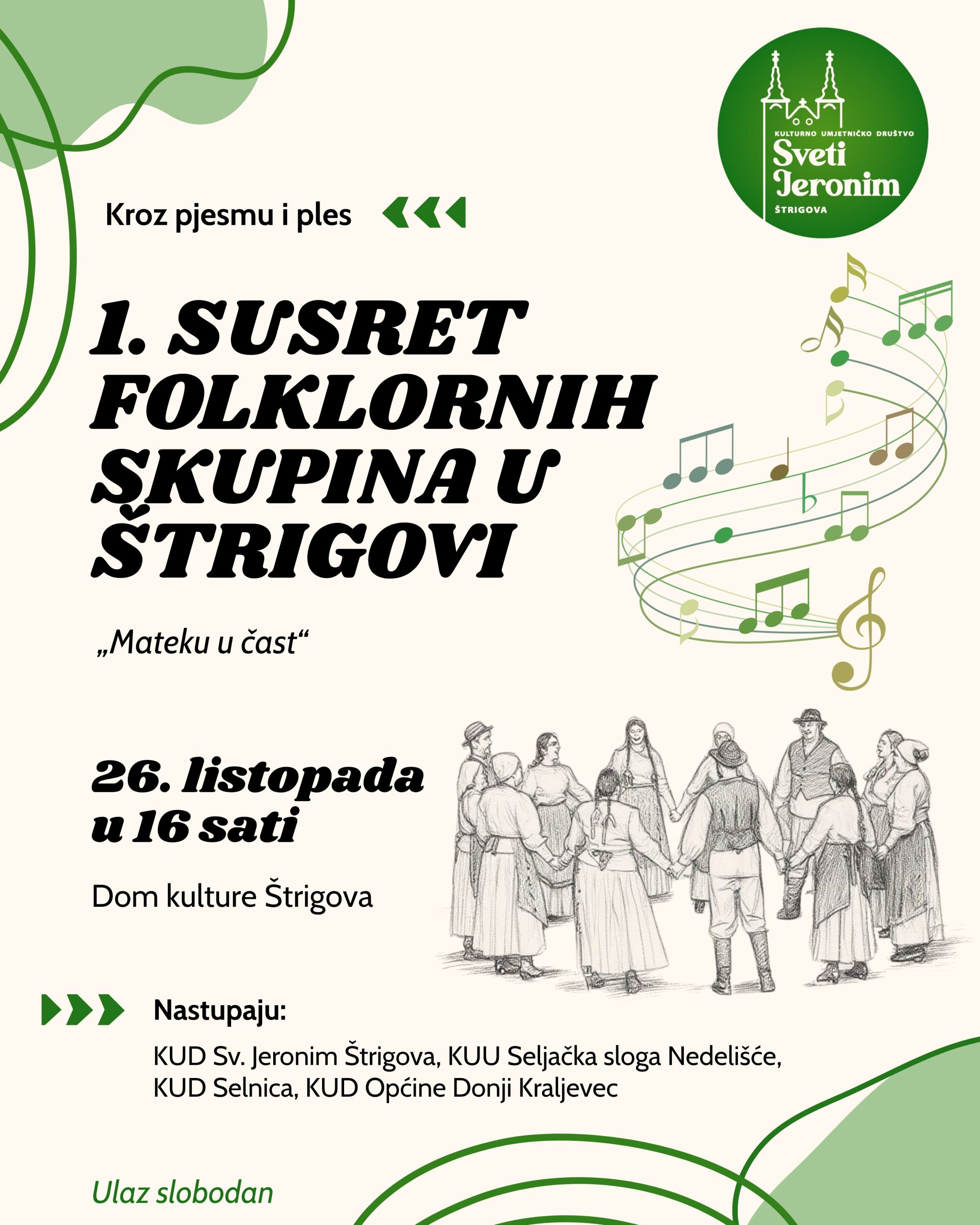 Prvi folklorni susret u Štrigovi u spomen na Matiju Grabrovića održat će se u nedjelju, 26. listopada 2025. s početkom u 16:00 sati, u Domu kulture u Štrigovi. Riječ je o kulturnoj manifestaciji pod nazivom „Mateku u čast“, posvećenoj očuvanju međimurske folklorne baštine i uspomeni na velikog zaljubljenika u tradicijsku kulturu i dugogodišnjeg kulturnog djelatnika koji je ostavio neizbrisiv trag u folklornom životu Međimurja, pa tako i u KUD-u „Sv. Jeronim“ Štrigova.
